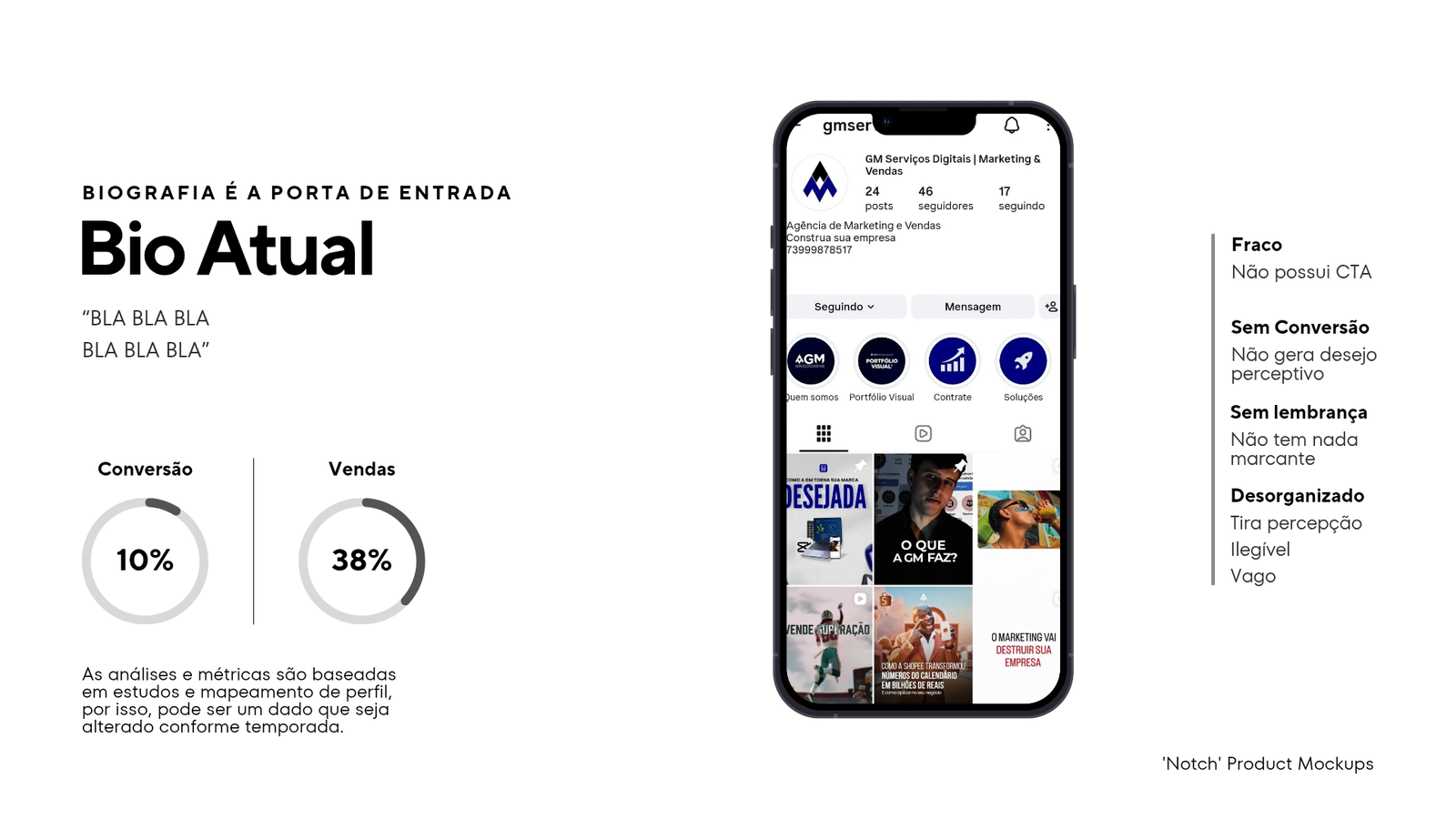 A verdade é que muitos perfis comerciais têm produtos ótimos, mas a estética, organização e percepção visual não transmitem profissionalismo e desejo nos primeiros segundos.